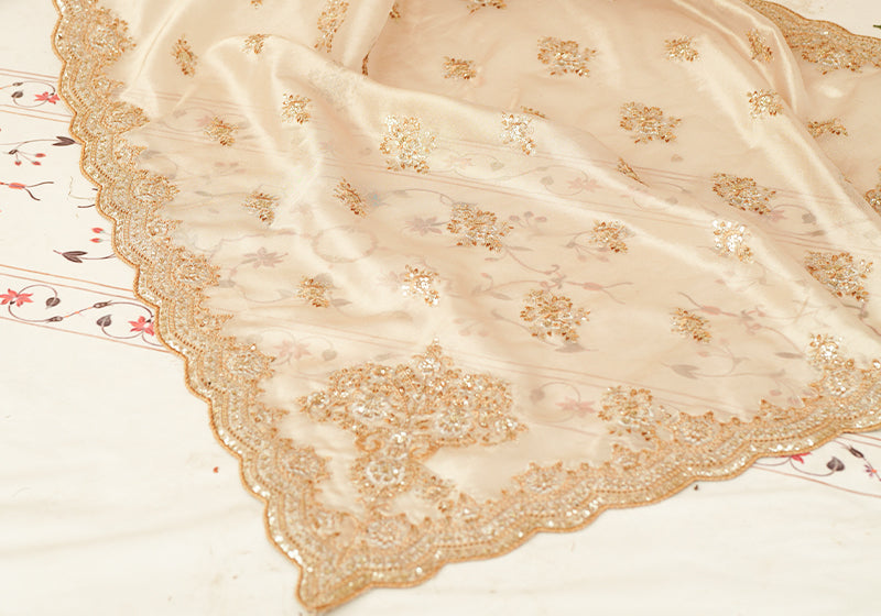- This light gold shawl features a classic monochrome tissue design, elegantly framed with scalloped embroideries and intricate motifs on the corners. Each element is delicately adorned with a single drop of French cut sequin, adding a subtle sparkle. This timeless piece embodies understated luxury, perfect for elevating any ensemble.