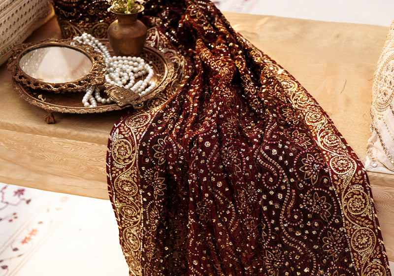 - Introducing the maroon shawl, crafted for the first time by the House from luxurious tussar silk. This extravagant piece features a symphonic bandhni pattern set against a rich, three-toned ruby base, creating a harmonious blend of colors and textures.