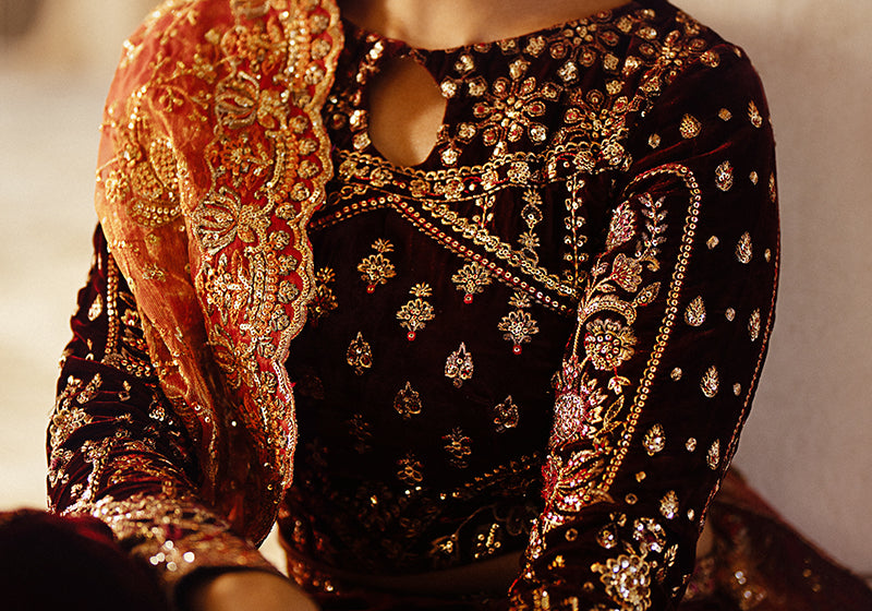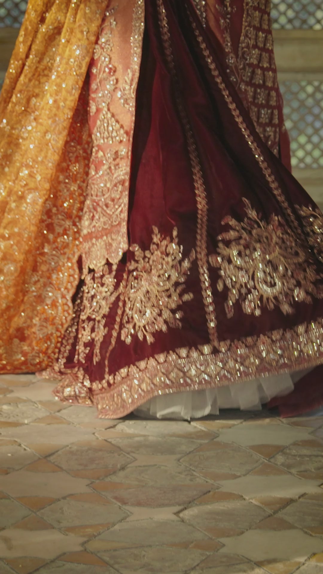 Look 06/10 Dastoor #AIKLuxuryVelvet ‘24 - A regal ruby velvet lehenga choli. The blouse is embroidered with an elaborate tilla and sequin design, while the lehenga features 16 kaliyan with ornamental motifs on the hem. A sleeveless maroon tulle gown, layered over a two-toned masoori silk underlay, creates a fiery, multi-chromatic effect that enhances the ensemble’s richness. A matching tissue lame dupatta, detailed with a traditional sequin jaal, completes the Look.