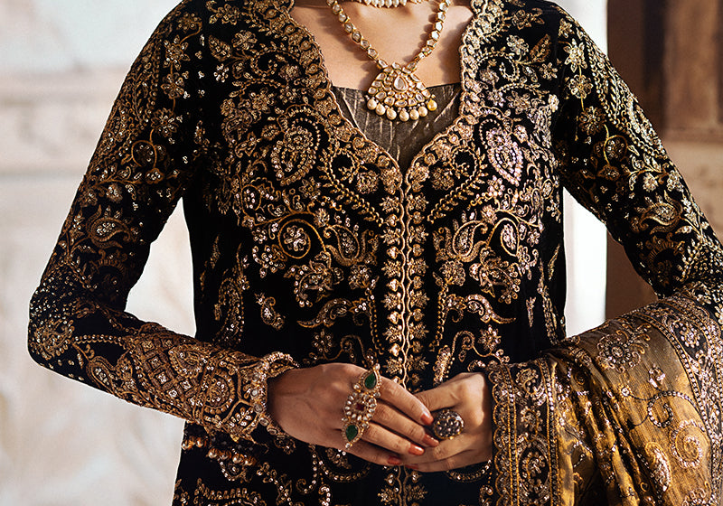Look 08/10 Dastoor #AIKLuxuryVelvet ‘24 - The Indian paisley, evolved in the valleys of Kashmir and was transported from pashmina shawls to the grand Mughal embellishments. This design, fashioned from onyx velvet is the evocation of the paisley. An amalgamation of multiple motifs sways across the kameez, with elaborate tilla detailings and sequin accents. The gold masoori for the pants is woven with black resham, while the gilded lamé dupatta is dipped in black dye for the same regality.