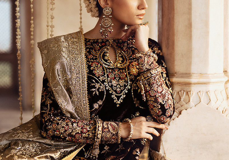 Look 09/10 Dastoor #AIKLuxuryVelvet ‘24 - A pattern of blooming florals encompass this sumptuous auburn velvet base, laden in tilla embroideries and bronzed sequins. The neckline, chaak and hems are adorned with more structural elements. Paired with silk brocade for the trousers and a gilded tissue chaadar with a web of glistening embroidered patterns, this Look evokes glorious splendour.