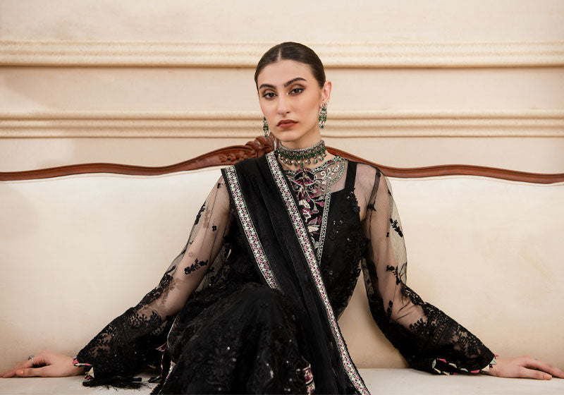 The second design is designed on a black tulle base, the most dynamic colour there is, that signifies a daring femininity. A hint of movement flaunts the majestic glimmer of thousands of sequins embroidered on the shirt, with a dense decoration of jewel toned motifs for the neckline. The look is complemented with a light booti dupatta framed with floral arrangements on the corners.