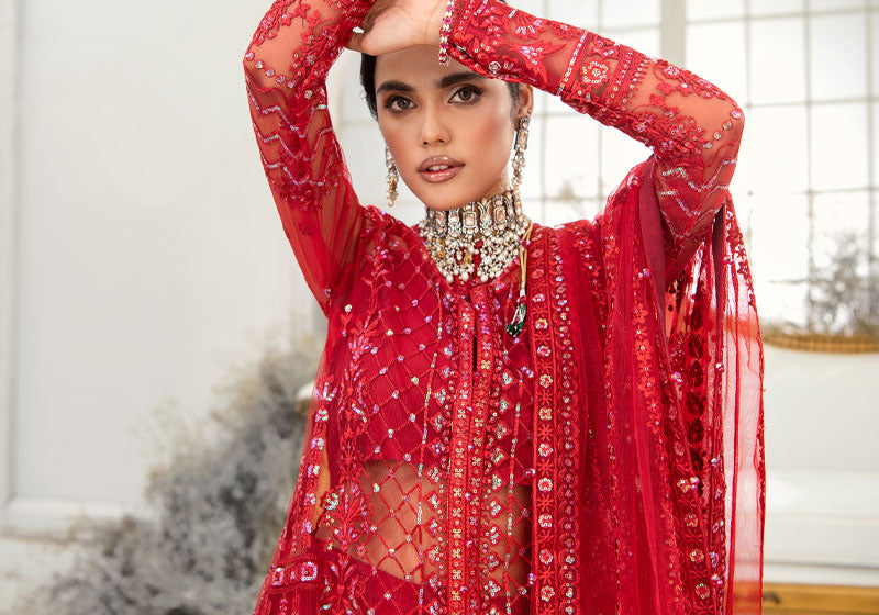With each taanka precisely layered with prismatic sequin-work, this tulle design personifying scarlet serenity serves at the perfect start of this collection. The embroidery planned and crafted to form a subtle base underneath the elaborate embellishments.