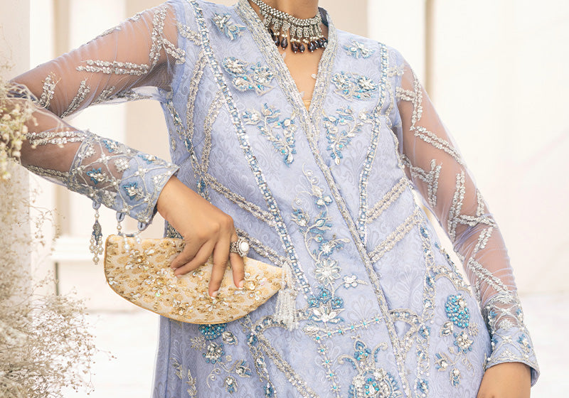 A design that effortlessly blends contemporary style with timeless elegance. This exquisite lavender-hued tulle piece is a harmonious fusion of monochrome sophistication, delicate azure crystal hues, and glistening pearl-work. The shirt features a composition of elaborate ornaments suspended across an intricate framework of tilla-infused patterns, creating a mesmerizing interplay of colours. Details of blue and white beads and an array of sparkling sequins are scattered across the design.